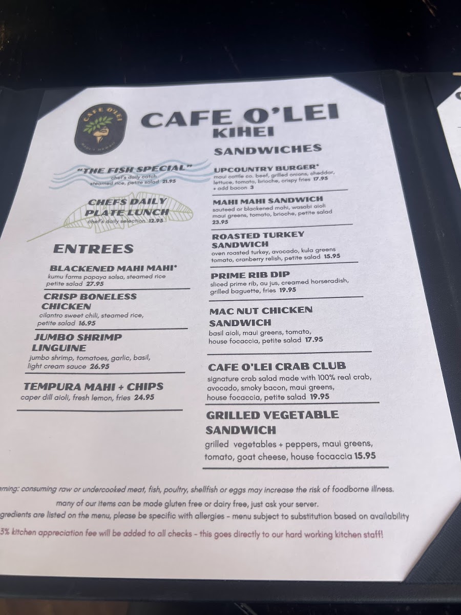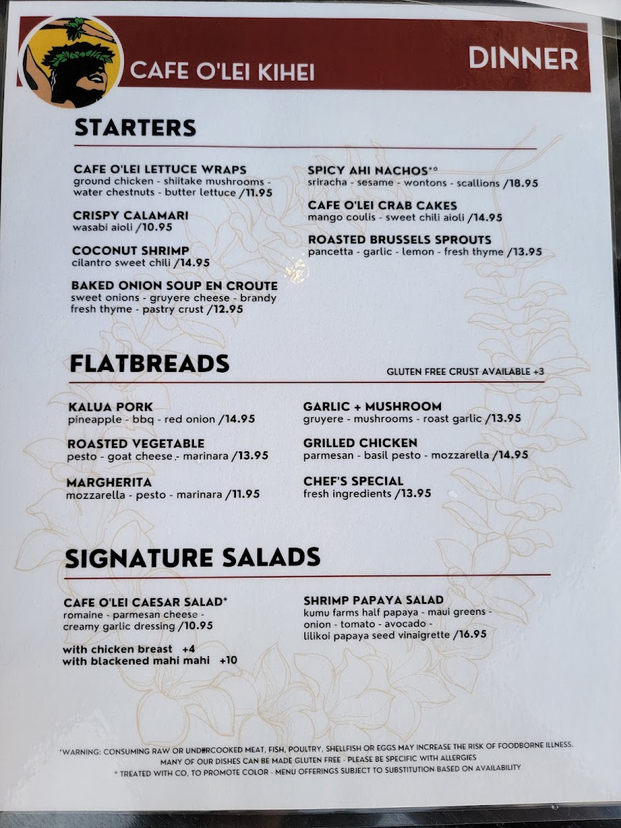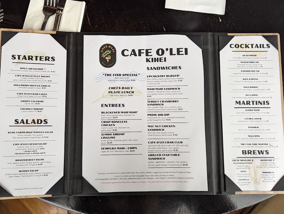 Nestled in the heart of Kihei, Cafe O'Lei offers a delightful fusion of Pacific Rim flavors. The menu spotlights a variety of dishes that celebrate fresh local ingredients. For lunch, the signature salads are a must-try, particularly the Shrimp Papaya Salad, blending juicy shrimp with a refreshing lilikoi vinaigrette. Sandwich lovers will relish the Mac Nut Chicken Sandwich, where tender chicken meets aromatic basil aioli. Additionally, guests rave about the perfectly seasoned fries that accompany many dishes.